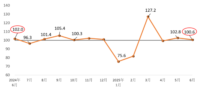 The Building Materials Industry Prosperity Index for June 2025 was 100.6 points, above the critical threshold, indicating an expansionary range. It decreased by 2.3 points compared to May and was 1.4 points lower than the same month last year, showing a trend of steady operation with slowing momentum in the building materials industry.